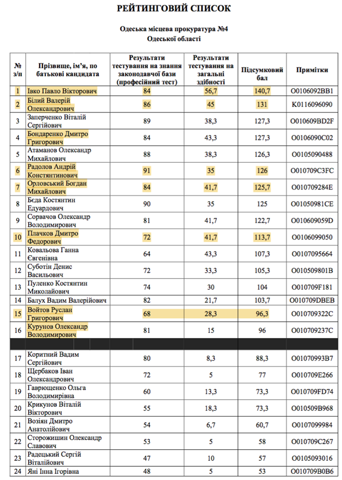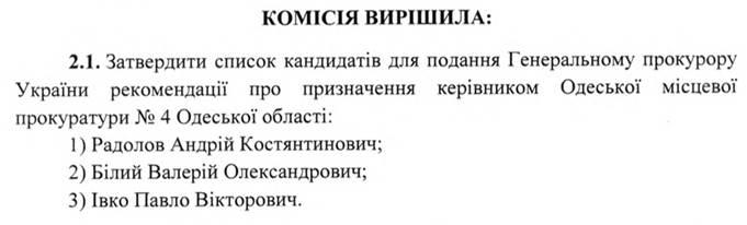 По результатам прошлогоднего конкурса, на должность руководителя Одесской местной прокуратуры № 4 Одесской области конкурсная комиссия рекомендовала: 1) Андрея Радолова - начальника организационно-методического отдела прокуратуры Одесской области (фигуранта списка КостенкоКичука); 2) Валерия Билого - сотрудника прокуратуры Суворовского района (фигуранта списка КостенкоКичука); 3) Павла Ивко – старшего прокурора Приморского района.