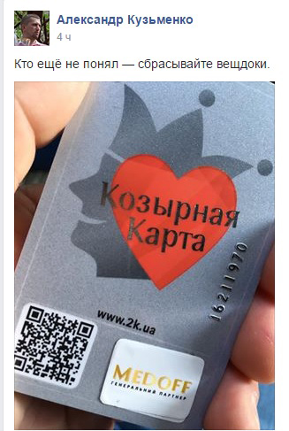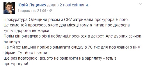 В этом контексте необходимо вспомнить, что задержание Валерия Белого и характер сообщения об этом главы ГПУ Юрия Луценко вызвало серьезный резонанс и скепсис со стороны коллег прокурора. Бывший 1-й зам прокурора Печерского района, позднее люстрированный с должности прокурора Приморского района Одессы Александр Кузьменко в свойственной ему ироничной манере прокомментировал «квалификацию» деяний Белого по требованию скидки емким комментарием и фото.