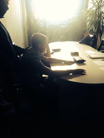 Видеофиксация спецоперации начинается с того момента, где сотрудник спецназа ключом открывает дверь и оказывается внутри офисного помещения. Пройдя по коридору в сопровождении еще ряда «чекистов» и видеооператора, СБУшник поворачивает направо и входит в небольшой кабинет, где сидят прокурор и его спутница-брюнетка. Законник не оказывал сопротивления правоохранителям при задержании, боец в маске войдя в помещение скомандовал: «Добрый день! Руки на стол! На стол руки положил, и не дергаемся, понял?!». Вслед за этим сотрудник СБУ обратился к сидящей рядом с Белым женщине, которая явно находилась в замешательстве от происходящего: «Девушка, руки на стол положите».