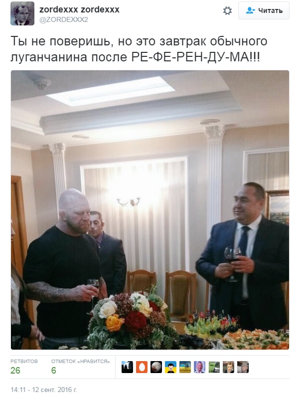 «О, это же американец, настоящий, у нас в гадюкино. Так, ану быстро все лучшее на стол, это же американец», «...в блокадном Ленинграде тоже икру ели члены правительства», «Повесить бы баннер с этой фоткой в Луганске и написать: ««Глава» и «гражданин» «калякают» за «республику»», «У потного брат Митька нашелся?)», «Как принимают шахтеров из USA», - шутят в комментариях к фото пользователи соцсети.