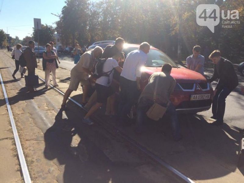 В центре Киева неизвестный водитель припарковал авто и заблокировал движение трамваев