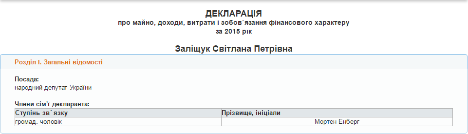 Отмечается, что квартира появилась в декларации нардепа в 2013 году. Мортен Энберг, который якобы купил квартиру в Киеве, был указан в декларации Светланы Залищук за 2015 год.