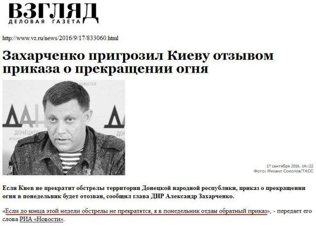 Захарченко угрожает отозвать несуществующий приказ о прекращении огня в понедельник. Мол, сейчас мы не стреляем, а только терпим обстрелы ВСУ, но терпеть будем только до понедельника.