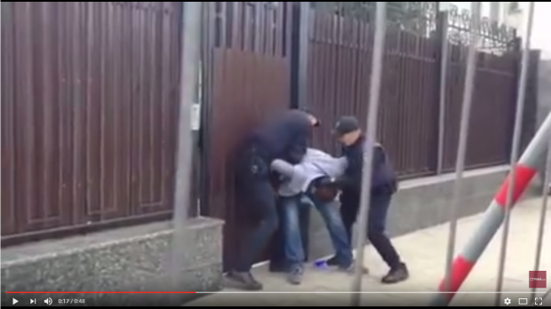 И тут же публикуется «СТРАНА.юа», чей корреспондент очень «вовремя» заснял задержание практически неподвижного Вовы, находившегося почему-то уже за забором посольства.