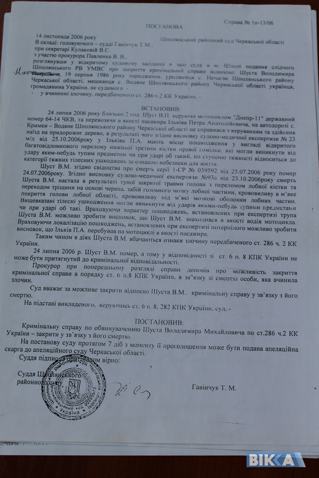 У постанові Шполянського районного суду тоді було зазначено, що "справу по обвинуваченню Шуста Володимира Михайловича по ст. 286 ч. 2 КК України – закрити у зв’зку з його смертю". Михайло Шуст підкреслив, що при цьому кримінальна справа щодо Петра Ільківа тоді не закривалась, а відносно його сина не порушувалась.
