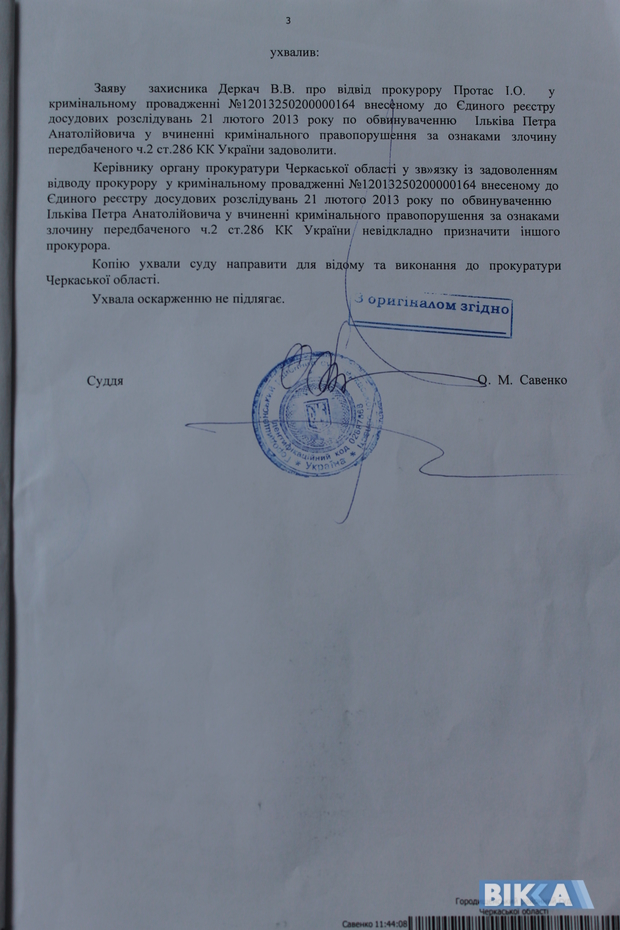 "Там мене очікували суддя, що закрив справу, де зазначалося, що за кермом був мій син, та прокурор, котрий вів цю справу. Вони виказали обурення щодо мого звернення до СБУ. Погрожували. Думали залякати. Я вже бачив наручники, які на мене хотіли одягнути. На щастя, у Генпрокуратурі мені дали номер телефону, куди я міг би зателефонувати у особливому випадку. Дивом мені вдалося додзвонитися туди", – розповідає черкащанин.