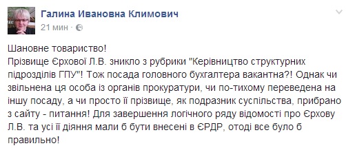 Первой информацию об исчезновении фамилии Ерховой в соответствующем разделе руководящего состава надзорного ведомства обнародовала в своем Fb бывший следователь ГПУ Галина Климович.