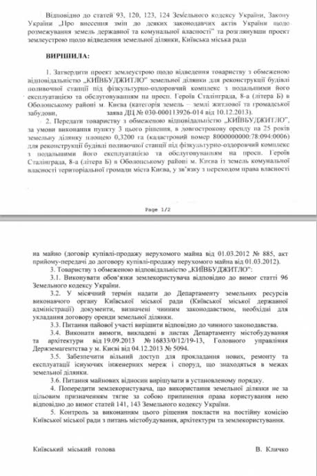 Згідно з документом, уже затверджено проект землеустрою щодо відведення ТОВ "Київбуджитло" землі на проспекті Героїв Сталінграда, 8-а (літера Б), для реконструкції будівлі поливочної станції під фізкультурно-оздоровчий комплекс - "з подальшими його експлуатацією та обслуговуванням".