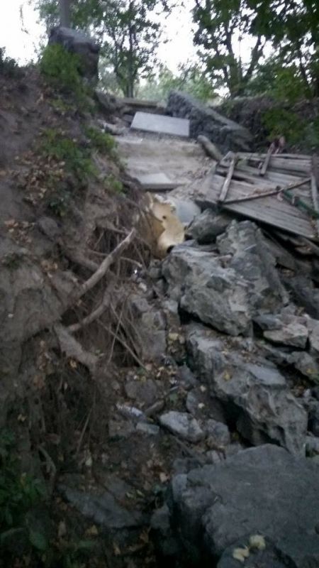 Але оскільки парк розташований на схилах, тривають незворотні процеси. Зсуви руйнують доріжки та сходи. Те, що прямо в парку розташований офіс комунального підприємства, яке опікується парками в районі, ніяк не допомагає.