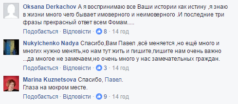 "А я воспринимаю все Ваши истории как истину ,я знаю в жизни много чего бывает имоверного и неимоверного .И последние три фразы прекрасный ответ всем Фомам..." - отметила Оксана Деркачева.