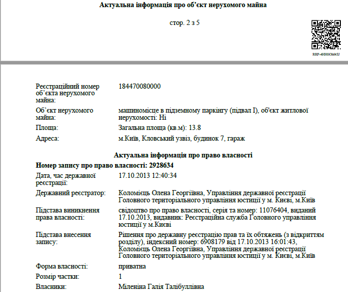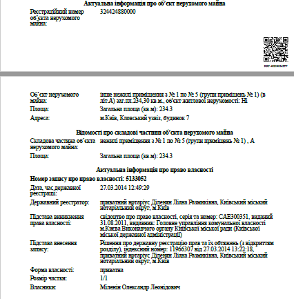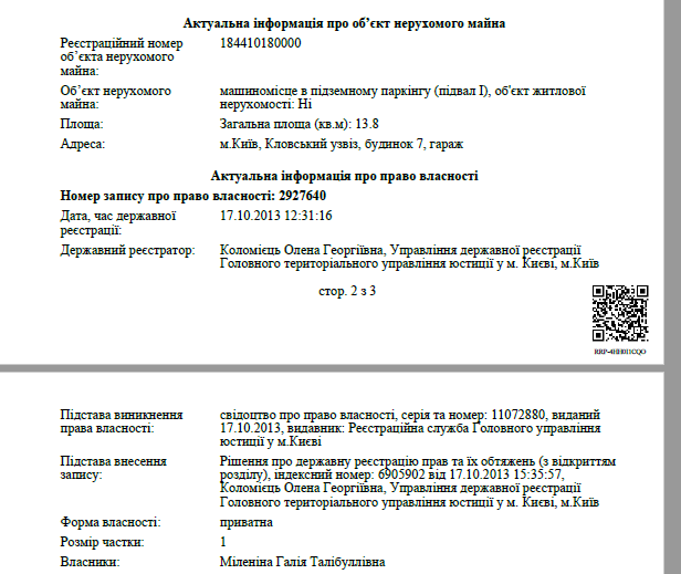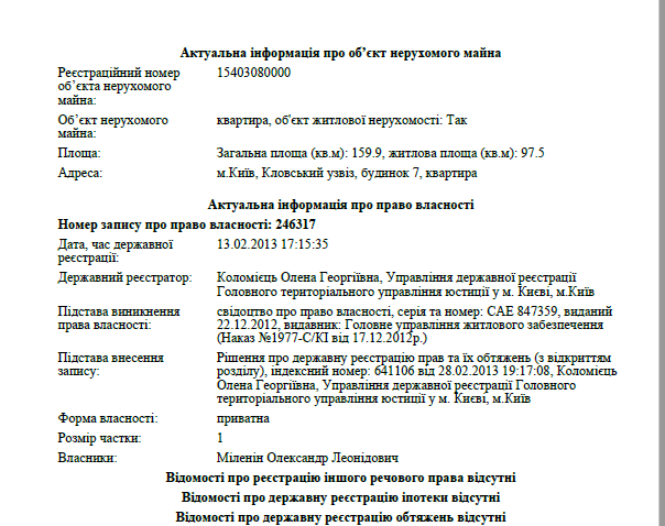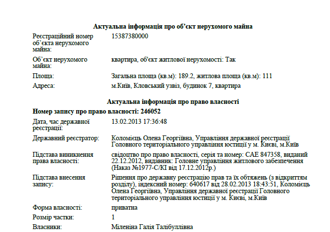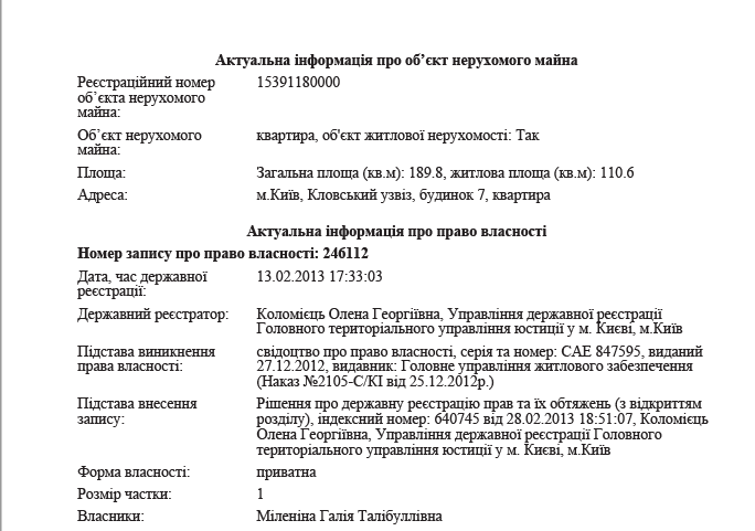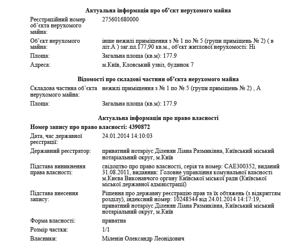 Ще 4 квартири, 4 паркомісця та понад 400 квадратних метрів офісів в будинку на Кловському узвозі, 7 записані на батьків прокурора - Олександра та Галію Міленіних. Ринкова ціна такої площі нежилих приміщень в цьому будинку - від 30 мільйонів гривень.