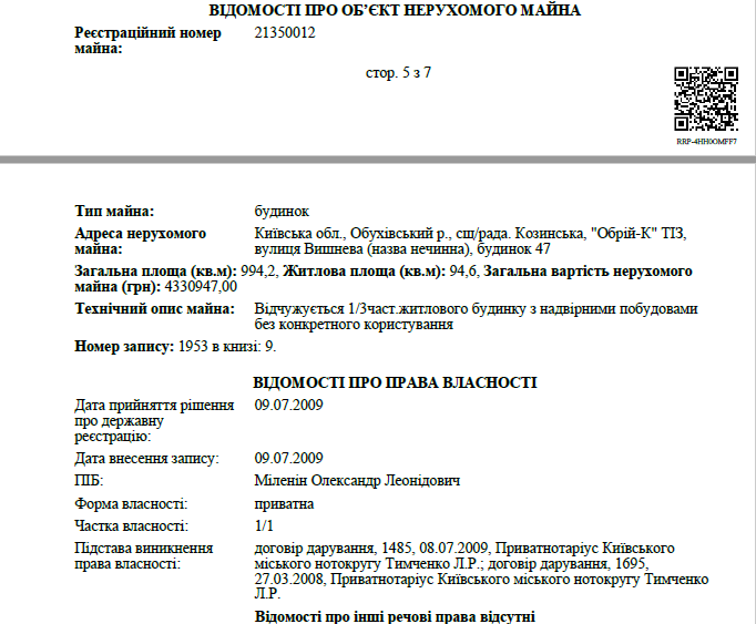 Ще на Олександра Міленіна зареєстрований будинок в Конча-Заспі (Козин) на 1000 квадратних метрів та 30 соток землі під ним. Вказана в документах вартість нерухомості - 4,3 млн. грн. Хоча нині нерухомість такої площі в Козині продається за32 млн. грн.