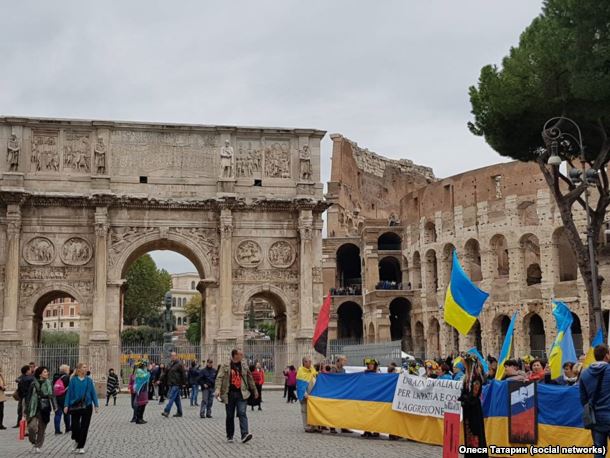 Как стало известно «фрАзе», под стенами Колизея и у арки Константина собрались полсотни активистов украинского общества с антивоенными лозунгами и национальной символикой.