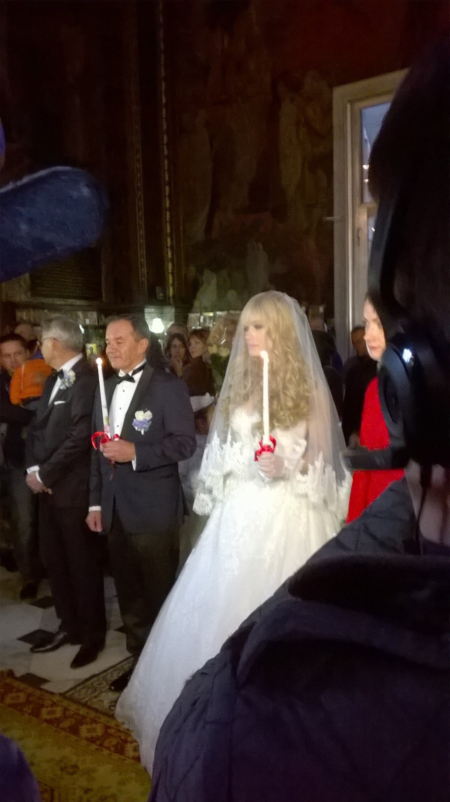 Венчание началось в 12:00. Невеста была одета в пышное белое платье с корсетом и длинной фатой, которую несли дети. После церемонии вечером молодожены устроили праздничный ужин для близких и друзей.