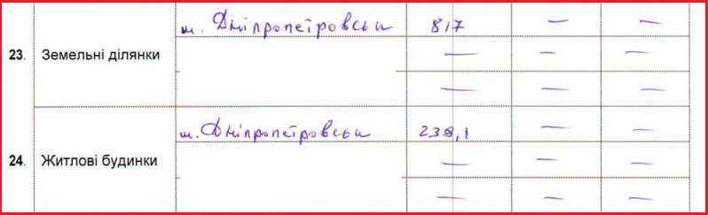У власності ж матері, Валентини Григорівни, є будинок у Дніпрі по вул. Червонопартизанська та земельна ділянка для садівництва в сщ/раді Ювілейній.