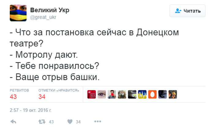 ’KsN: Холопы не могут жить без трупа Ленина, или трупа какого другого подонка, ставшего для них идолом. Лесной Брат: Что там, водку раздают? «Я вижу, в Донецке сумели построить рай. Людям не надо работать, потому что посреди рабочего дня находят время посмотреть на трупик животного», — пишет в Twitter пользователь «Каменяр». Каменяр: Как львовянин, прошу не злиться на дончан. Потому что действо явно срежиссированно для камер, согнали бюджетников в рабочее время. Ну и дебилы пришли, факт. «Не судите людей, которые пришли на прощание с Моторолой, они просто хотят лично убедиться, что эта тварь сдохла», — комментирует пользователь Twitter «Серый Кардинал». Чудо-ВаЩе: Так Арсений Павлов впервые попал в Оперный Театр.