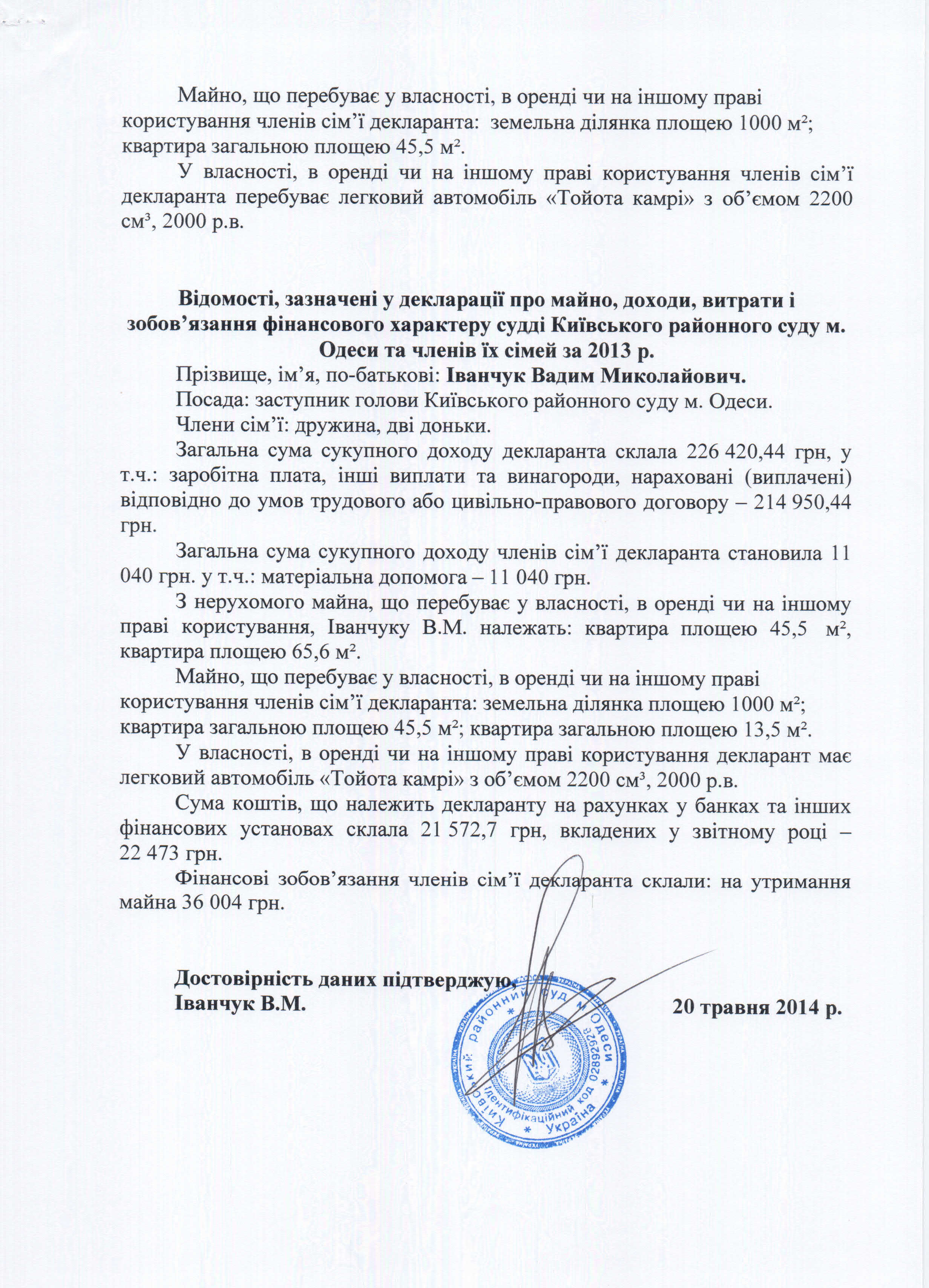 Так, исходя из деклараций судьи Иванчука В.Н., ему и его семье принадлежат три квартиры площадью 45,5 кв.м., 65,6 кв.м., 13,5 кв.м.; земельный участок для выращивания овощей и ягод размером в 1000 кв.м., а также машина Toyota Camry 2000 г.в.