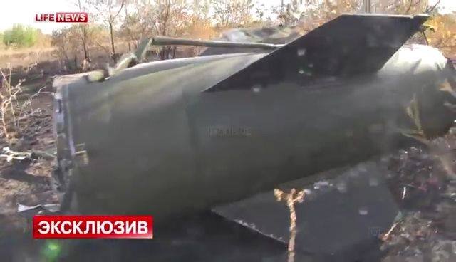 Вот эти первые четыре скриншота редактор сделал из репортажа "Лайфньюс" об уничтожении украинской колонны, прорывавшейся из Иловайска, в районе Старобешево Донецкой области. Видео позволяет четко привязаться к местности. Это фрагмент изделия 9М79-1 - ракетного комплекса тактического назначения "Точка-У" с дальностью действия до 70 километров. Головная боеголовка от ракеты не отделяется, поэтому очевидно, что подрыв произошел именно в этом месте.