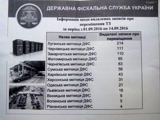 А тепер найголовніше. У результаті перевірки були встановлені зведені дані щодо видалених записів про переміщення транспортних засобів за період з 1 по 16 вересня 2016 року з розбивкою на окремі митниці: 788 авто (!). І це дані лише за два тижні вересня (!!!):