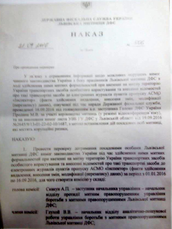 Є також копія наказу Львівської митниці ДФС від 21 вересня 2016 року № 506 про проведення перевірки, про яку йшлося на нараді ДФС від 16 вересня 2016 року.