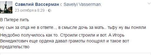 "Неудобно получилось как-то. Строили, строили и вот. А Игорь Венедиктович еще ордена давал, грамоты, поощрял, и такое вот предательство", - пишет девушка.