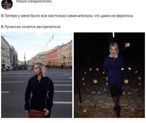 "В Питере у меня все было настолько замечательно, что даже не верилось. В Луганске хочется застрелиться", - добавила Свидовскова.
