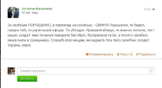 «За сербськи ПОРОШЕНКО, в перекладі на російську - СВИНЯ! Порошенко, ти бидло, говорю тобі, як український офіцер. Ти ублюдок. Кривавий вбивця, як мирних жителів, так і наших солдат, яких ти кинув помирати без зброї, боєприпасів та їжі, а після їх загибелі, кинув гнити в соняшниках. Спасибі ополченцям, які надають тіла твоїх загиблих солдат, Україна, землі», - написал на своей стене депутат.