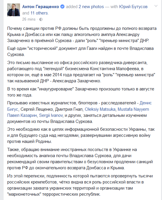 "Карьерный взлет" Захарченко прокомментировал на своей странице в социальной сети Facebook советник министра внутренних дел Украины Антон Геращенко.