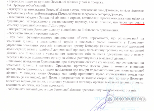 1. Земельный участок, согласно договора, был передан в аренду УПЦ КП в 2008 году. Часть 2 пункта 8.4 обязывает арендатора завершить застройку земельного участка не позднее трех лет с момента регистрации договора.