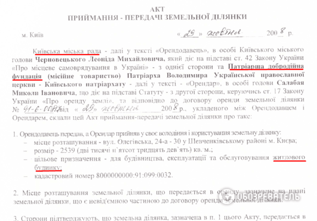 4. Согласно решению, земля была выделена под строительство одного жилого дома, а в "Щасливом маєтке" их восемь. Это подтверждает проект решения киевского городского совета "О предоставлении разрешения на разработку технической документации по землеустройству касательно раздела земельного участка религиозной организации "Патріарша добродійна фундація /місійне товариство/ патріарха Володимира Української православної церкви-Київський патріархат".