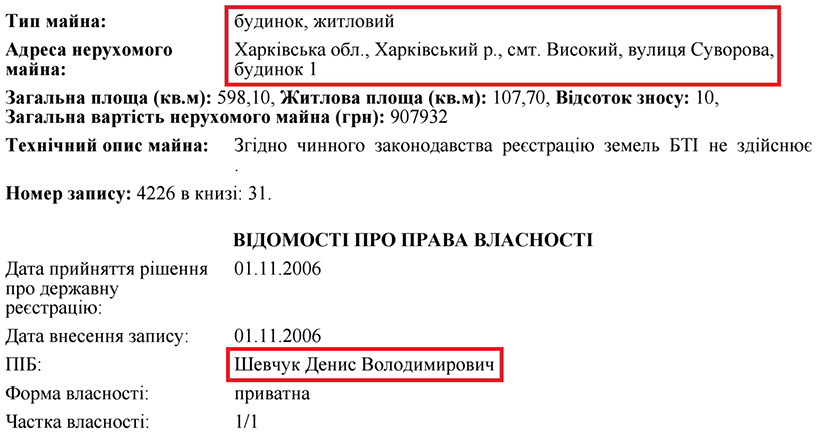 Денис Одд имеет в собственности дом площадью почти 600м² в пгт. Высокий под Харьковом, земельные участки 5508м² и 1983м² и гараж на 107,7м². Вот данный дом на фото.