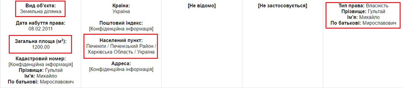 Кроме квартиры в собственности семьи Гультай есть 3 земельных участка: 1.200 кв. м., 2.500 кв. м . и 774 кв. м. Последние две принадлежат жене Михаила Гультая, Тамаре Александровне.