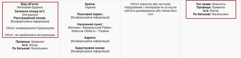 Также господину Кривенко принадлежит дом 81кв. м., ½ квартиры площадью 151,9 кв.м., ½ гаража площадью 20,40 кв. м. и недострой в с. Мотыжин Киевской области.