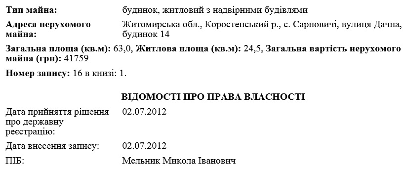 Само же имущественное состояние судьи Мельника весьма скромно. В собственности судьи есть два земельных участка площадью 2500м² и 2932м², дом на 63м², а также другое недвижимое имущество площадью 45,2м², что находится в комплексе отдыха "Пуща-Водица" Государственного управления делами. А вот о праве пользования государственной дачей в Конча-Заспе судья почему-то не упомянул. Видимо, это такая традиция большинства судей КСУ?