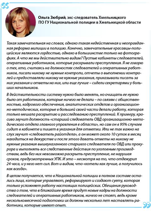 Одна из экс-следователей ПО ГУ Национальной полиции в Хмельницкой области рассказала интересную статистику: «После так называемой «реформы в райотделах» в следственных и оперативных подразделениях осталось по 1/3 работников, а это обычно 3-5 человек. У каждого из них нагрузка, по меньшей мере, в три раза больше, чем должна быть, ведь необходимо выполнять работу за двух человек, которых нет. Так, у одного следователя в производстве находится в лучшем случае около 200 уголовных производств, по которым он должен проводить следственные действия. Учитывая, что следователь и оперативный работник — обычные люди, которым необходим хотя бы сон, им кроме дежурств и проведения неотложных следственных (розыскных) действий ни на что времени не остается.
