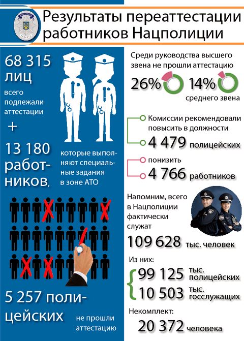 Всего подлежали аттестации 68 135 лиц, а также 13 180 работников, которые выполняют специальные задания в зоне АТО. По результатам, аттестацию не прошли 5257 полицейских. Среди руководства высшего звена не прошли аттестацию 26%, среднего звена — 14%.