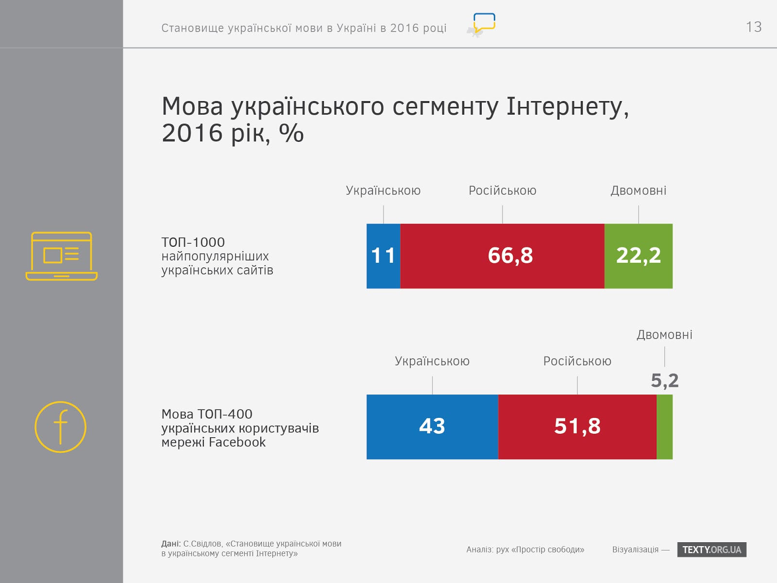 Мова українського сегменту Інтернету - переважно російська. Разом з тим українські користувачі частіше використовують українську мову в мережі Facebook.