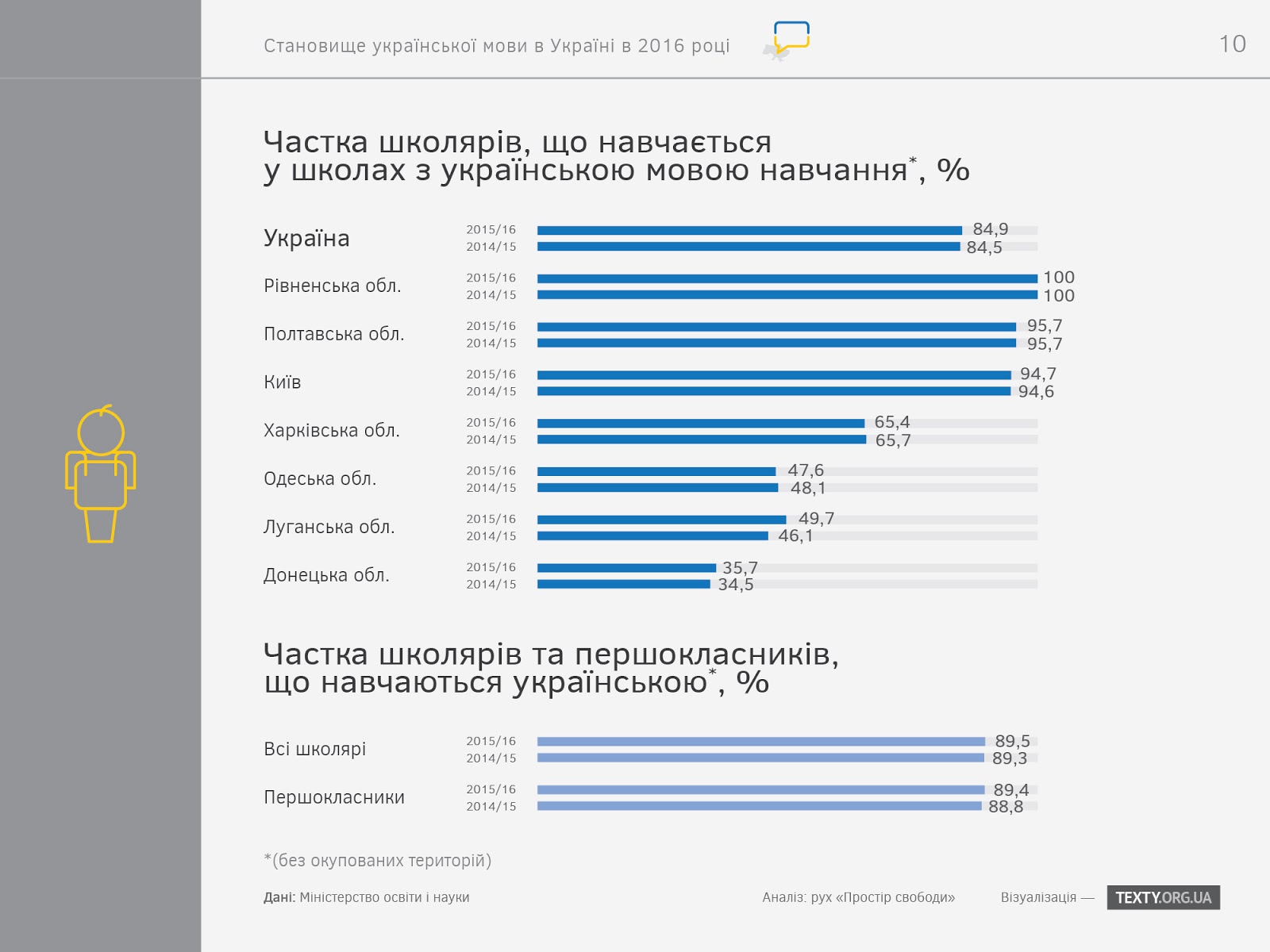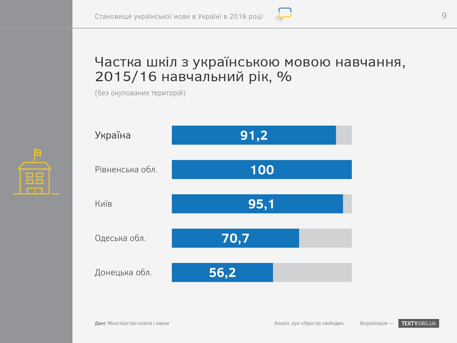 Частка школярів, що здобувають освіту українською мовою в 2015/16 році, сягнула 89,5%, зрісши за рік на 0,2%. Проте в деяких областях частка учнів, що навчаються українською, знизилася.