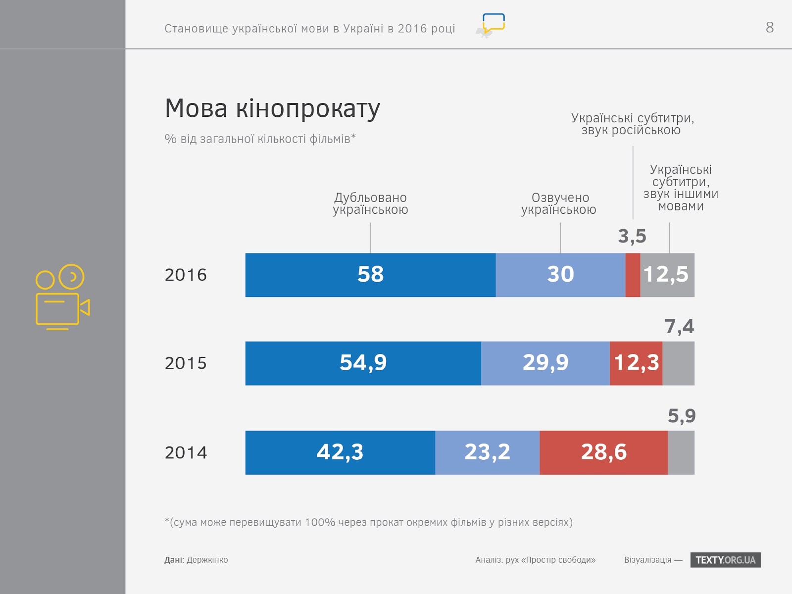 У кінопрокаті сумарна кількість фільмів, дубльованих або озвучених українською мовою, продовжує зростати і сягнула в 2016 році 88%. Частка фільмів з російським звуком знижується і становить цьогоріч менше 4%, решта фільмів демонструються мовою оригіналу (переважно англійською) з українськими субтитрами.