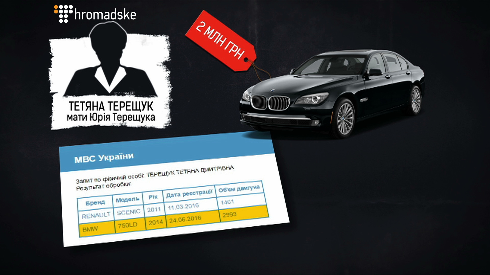 Ще близько двох мільйонів гривень коштує і розкішний автомобіль «BMW 750LD». Він, судячи з документів, як і ділянка в Зміїнці, також належить матері митника Тетяні Терещук. Цього року вона спромоглася купити одразу дві автівки.