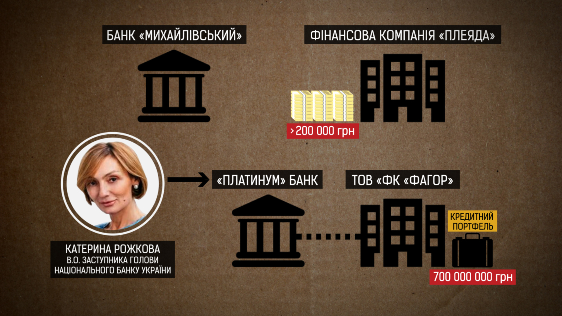 Також це надало можливість залучати кошти клієнтів на рахунки фінансової компанії «Плеяда», яка в подальшому придбала кредитний портфель фізичних осіб Банку обсягом майже у 700 мільйонів гривень і вже наступного дня передала іншій компанії - ТОВ «ФК «Фагор», яку пов’язують з «Платинум банком». Де в.о. голови правління свого часу працювала Катерина Рожкова.