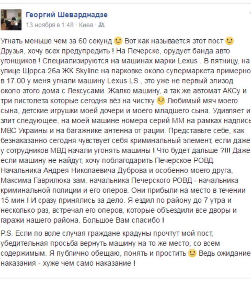 Шеварнадзе говорит, что это уже не первый случай угона элитных авто в этом месте и призывает всех быть осторожными. Также он возмущен тем, что в Киеве могут угонять машины даже у сотрудников МВД (мол, до какого уровня дошел разгул преступности). Но при этом он выражает благодарность главе Печерского РОВД, который оперативно прибыл на место преступления "вместе со своими операми".
