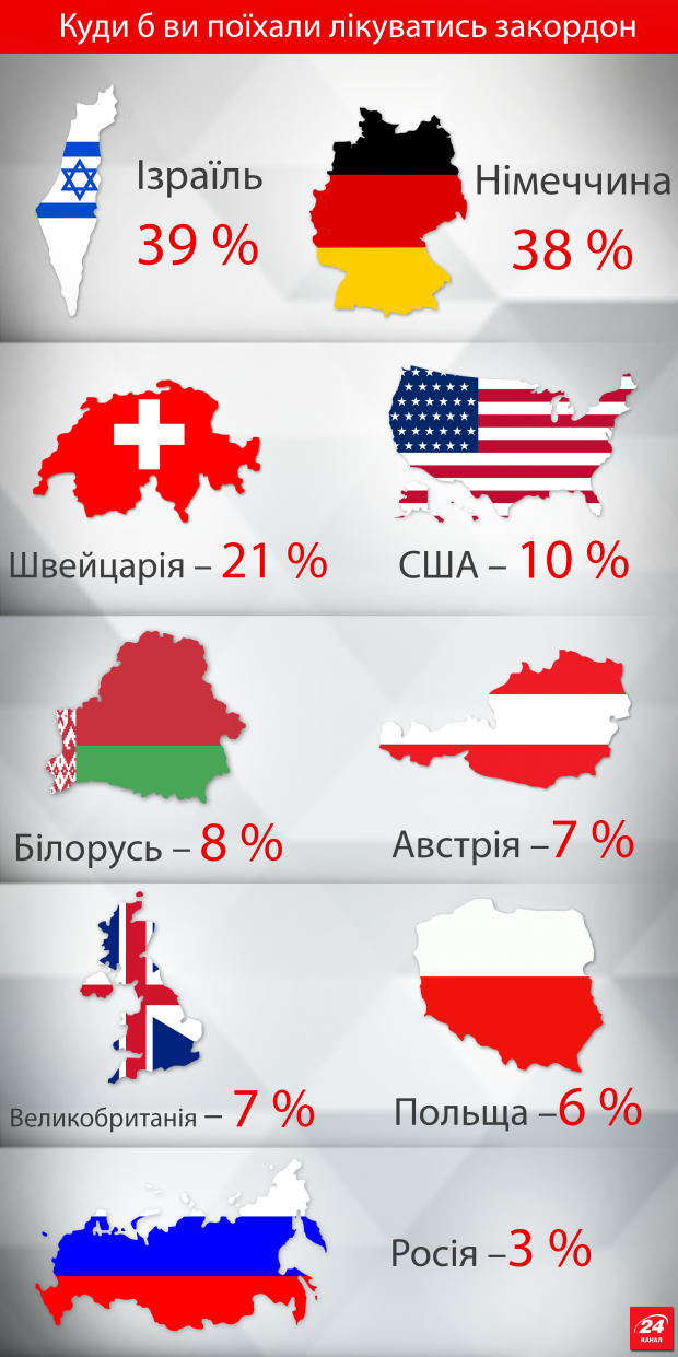 К слову, среди фаворитов украинцев – медицина Израиля и Германии – 39% и 38% соответственно поехали бы туда лечиться, при условии, что у них будут на это деньги. Еще 21% выбрал Швейцарию, 10% – США (респонденты могли выбрать несколько вариантов). А вот в Россию поехали бы лечиться лишь 3% опрошенных.