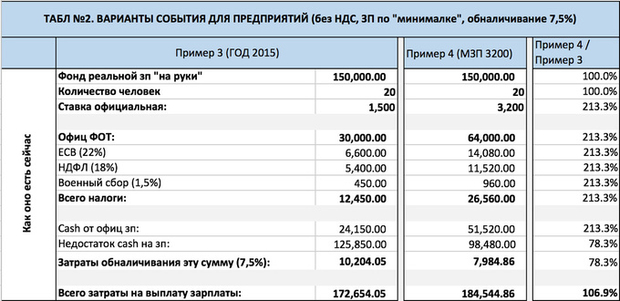 Более актуально будет рассмотреть предприятия, у которых официальная зарплата ниже обещанных с 1 января 2017 года 3200 гривен. Согласно Госстата, на июнь 2016 года количество работников, зарплата которых была ниже 3000 грн, составляет практически 39%. Для более точного анализа влияния увеличения минимальной зарплаты на бюджеты предприятий были взяты следующие микроэкономические модели с условиями: штат работников 20 человек с общей зарплатой 150 000 грн "на руки" в месяц: