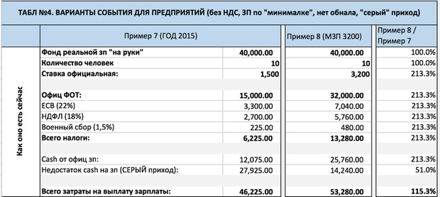 - аналогичные условия, как и в предыдущем, но с меньшим объемом: 10 человек и 40 000 грн на руки – рост затрат на ФОТ составит 15,3%.