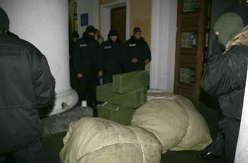 З Жовтневого палацу було вилучено - велику кількість тушонки, там були  генератори, військові намети, піддони, утеплювачі, спальні мішки, безліч всякого електроінструменту, буржуйки і т.д.