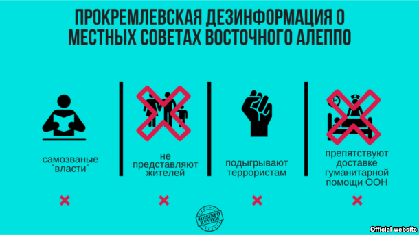 Так, например, «ТАСС» сообщает, что местные советы в восточной части Алеппо являются «самозванной властью» и далеки от того, чтобы представлять жителей»; что они «всячески подыгрывают террористам»; и что «обструкционистская позиция «советов» привела к отмене гуманитарной операции ООН по доставке помощи». Представление местных советов как органов, связанных с террористами, по мнению экспертов, является примером использования одного из главных методов прокремлевской дезинформации. Он состоит в том, чтобы называть террористическими те группы, которые не вписываются в прокремлевский нарратив.
