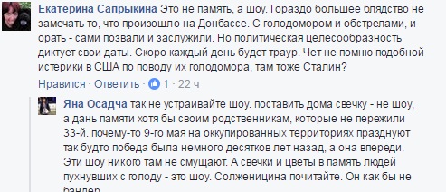 Яна Осадча нагадала автору поста про те, що навіть в тих регіонах України, які не постраждали під час Голодомору 1932-33 років, проводилися жалобні заходи, і люди ставили запалені свічки на підвіконня. У той же час деякі жителі Луганської області, "де люди вмирали, з ранку жеруть курку і запитують, чи погано про це писати".