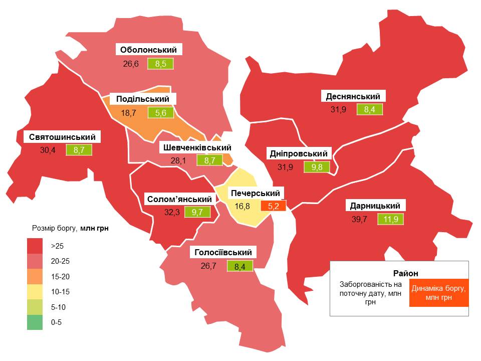 Крупнейшими должниками за электроэнергию перед “Киэвэнерго” стали потребители Дарницкого, Соломенского и Деснянского районов. Их задолженность по состоянию на 1 ноября составила 39,7 млн грн, 32,3 млн, и 31,9 млн грн соответственно.