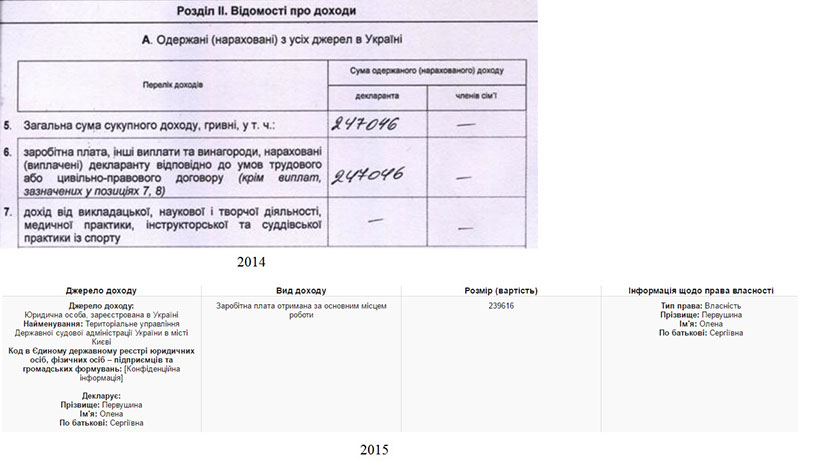 Давайте также проанализируем и имущественное состояние судьи Первушиной. Согласно декларации за 2014 и 2015 годы, единственным доходом семьи Елены Сергеевны является ее судейская заработная плата.